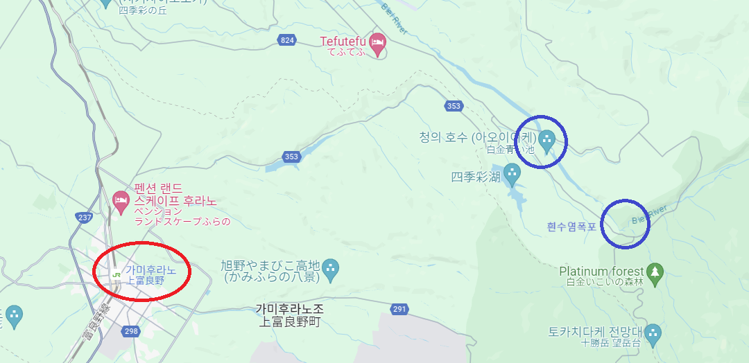 하지만 만약 대중교통을 이용하겠다고 한다면, 가미후라노역에서 내리면 안된다는 점을 반드시 명심하자. 청의호수와 흰수염폭포로 가는 직통 버스가 없기 때문이다. 여기보다 북쪽에 있는 지요가오카역에서 와야하며, 약 1시간 정도 소요된다. 훗카이도는 생각보다 넓다. 지금 위에 보이는 거리도 짧아보이지만, 가미후라노에서 청의호수로 자동차를 타고 가도 30분이다. 렌트카가 시간을 확연히 줄여주기 때문에, 사실 렌트를 하지 않는다면 여름의 훗카이도는 추천하지 않는다.