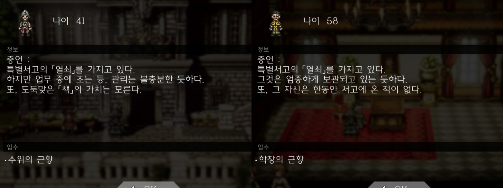 이와 같이 해당 NPC가 가지고 있는 정보를 준다. 사서의 증언에 따르면, 열쇠는 수위와 학장이 가지고 있다고 한다.