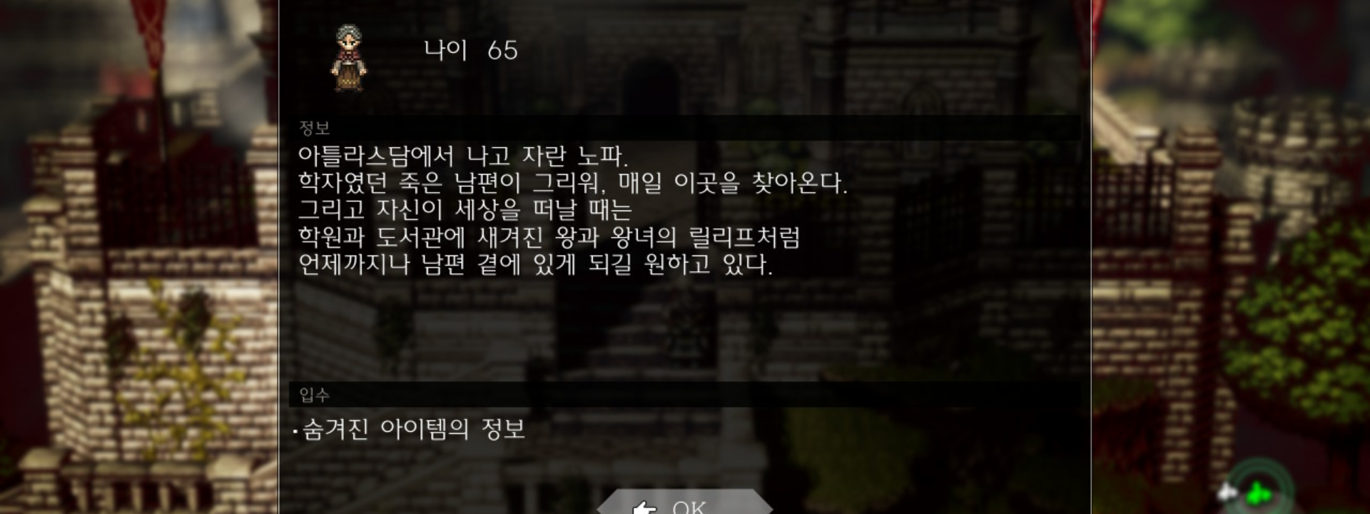 일반적인 대화에서는 이곳이 왕립학원임을 알려주는 서브NPC이지만, "탐색"을 활용하면, 아틀라스담 태생의 노파이며, 학자였던 남편이 그리워 이곳에 매일 찾아온다는 정보를 입수할 수 있다. 아래 <입수>란을 보면 "숨겨진 아이템의 정보"를 얻었다고 나온다.