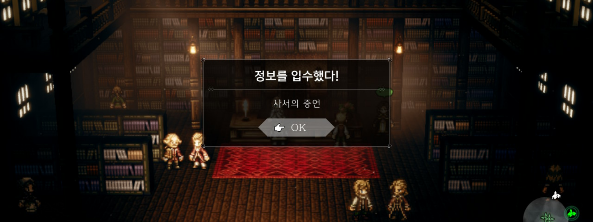 이렇게 "사서의 증언"이라는 정보를 입수한다. 이 게임에서는 플레이어가 어떤 내용을 알고 있는 것이 중요한 게 아니고, 이렇게 해당 정보를 아이템을 획득할 때와 같이 얻어내야 그 의미가 생긴다.