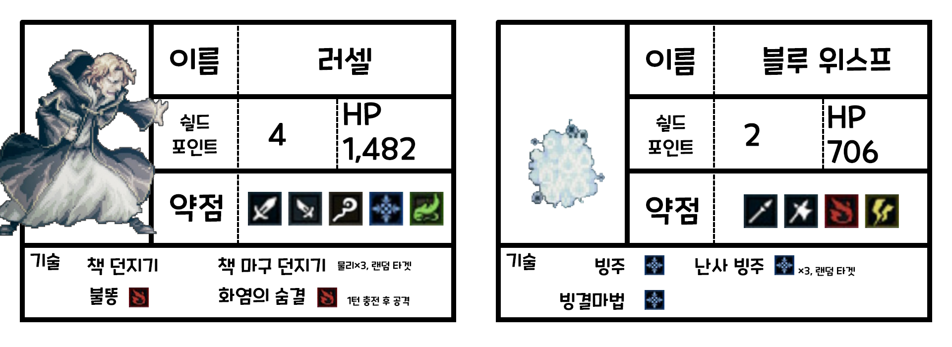 보스 러셀과 그 수하들 블루 위스프 2개가 등장한다. 사이러스는 사실 기본 스탯이 좋은 편은 아니기에, 당장에 2턴만 보더라도 순위가 위스프에 밀려있는 모습을 볼 수 있다. 먼저 아래의 몬스터 정보를 살펴보자.