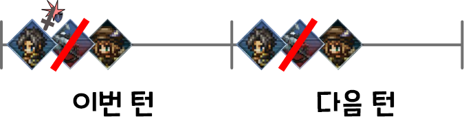 이번 턴에는 내가 후순위였다고 가정해보자(상황 2). 똑같이 쉴드포인트가 1이었어서 이번 턴에 내 공격으로 브레이크 상태가 된 것은 위나 아래나 똑같다. 브레이크는 위에서 말한 것과 같이 "다음 턴까지"만 행동불능이 되므로 위의 경우도 마찬가지로 다음 턴에는 행동불능이 된다. 다만 위의 경우에는 두 번의 공격기회를 뺏었지만, 아래는 한 번의 공격기회만 뺏는다. 큰 차이가 아닌 것처럼 보이지만, 3턴 뒤의 모습을 보면 조금 이야기가 달라진다.