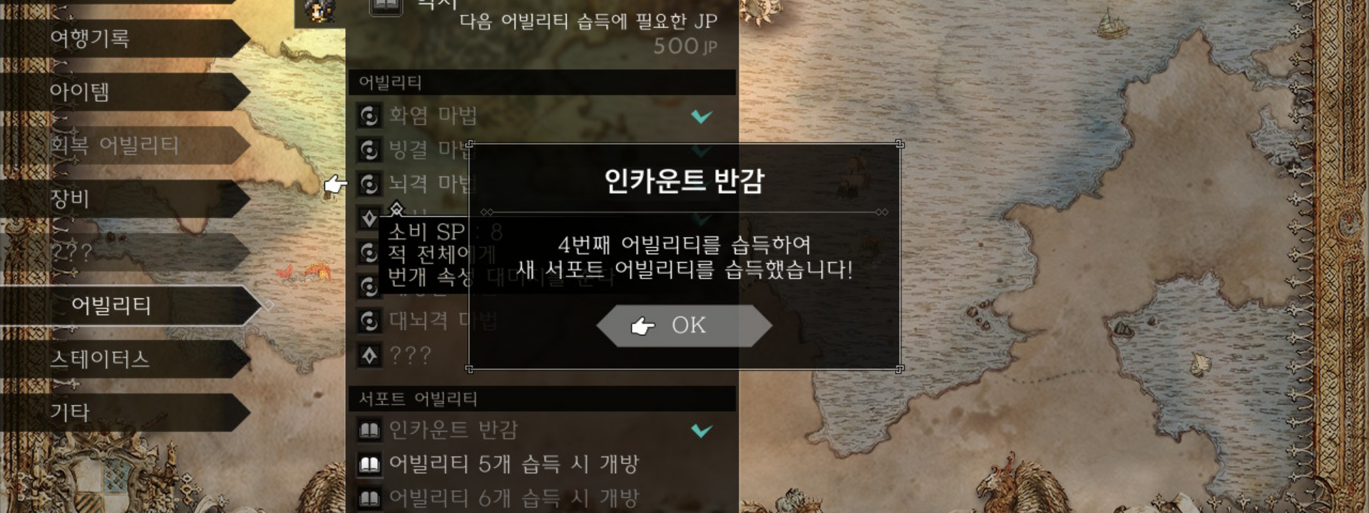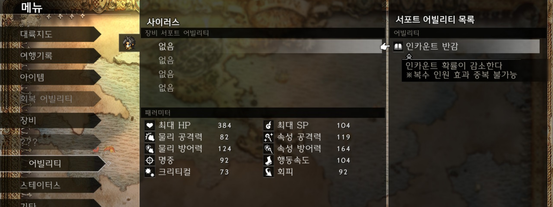 이렇게 사이러스는 화염, 빙결, 뇌격, 조사 총 4개의 어빌리티를 습득하였다. 서포트 어빌리티를 보면 "어빌리티 4개 습득 시 개방" 이라고 쓰여있던 곳이 "인카운트 반감"이라 바뀐다. 이를 확인하기 위해 메뉴의 어빌리티 창으로 다시 돌아가자.