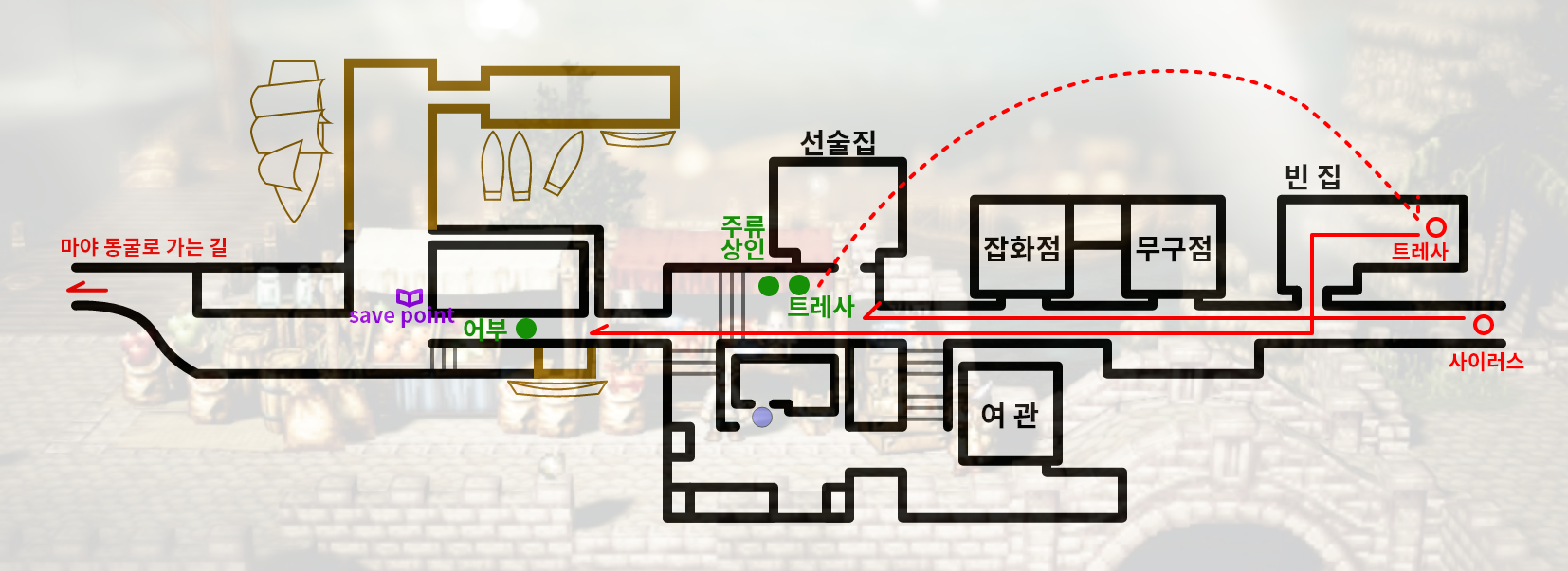 사이러스에게는 NPC에게서 정보를 캐내는 "탐색"이 있었다면, 트레사에게는 NPC가 가지고 있는 물건을 특정 금액을 지불하고 가져올 수 있는 "매입"이라는 필드커맨드가 있다. 이를 사용해보는 튜토리얼과 같은 진행이다. 우선 술을 매입하기 위해 술을 구하기 쉬운 곳! 주점으로 가보자. 주점은 마을 가운데 위치해 있다.