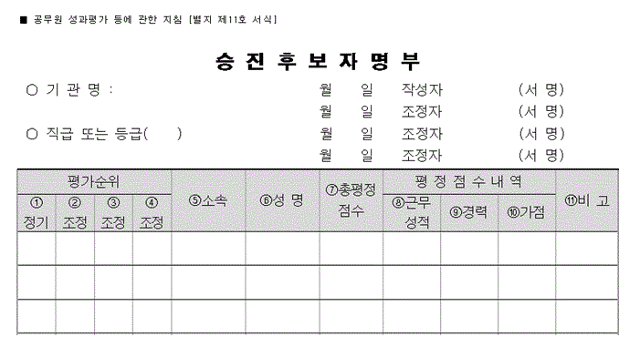 우선 승진후보자 명부는 1. 31.과 7. 31.을 기준으로 별지 11호 양식에 따라 두 번 작성하도록 하고 있다. 우선 별지 11호를 살펴보자.