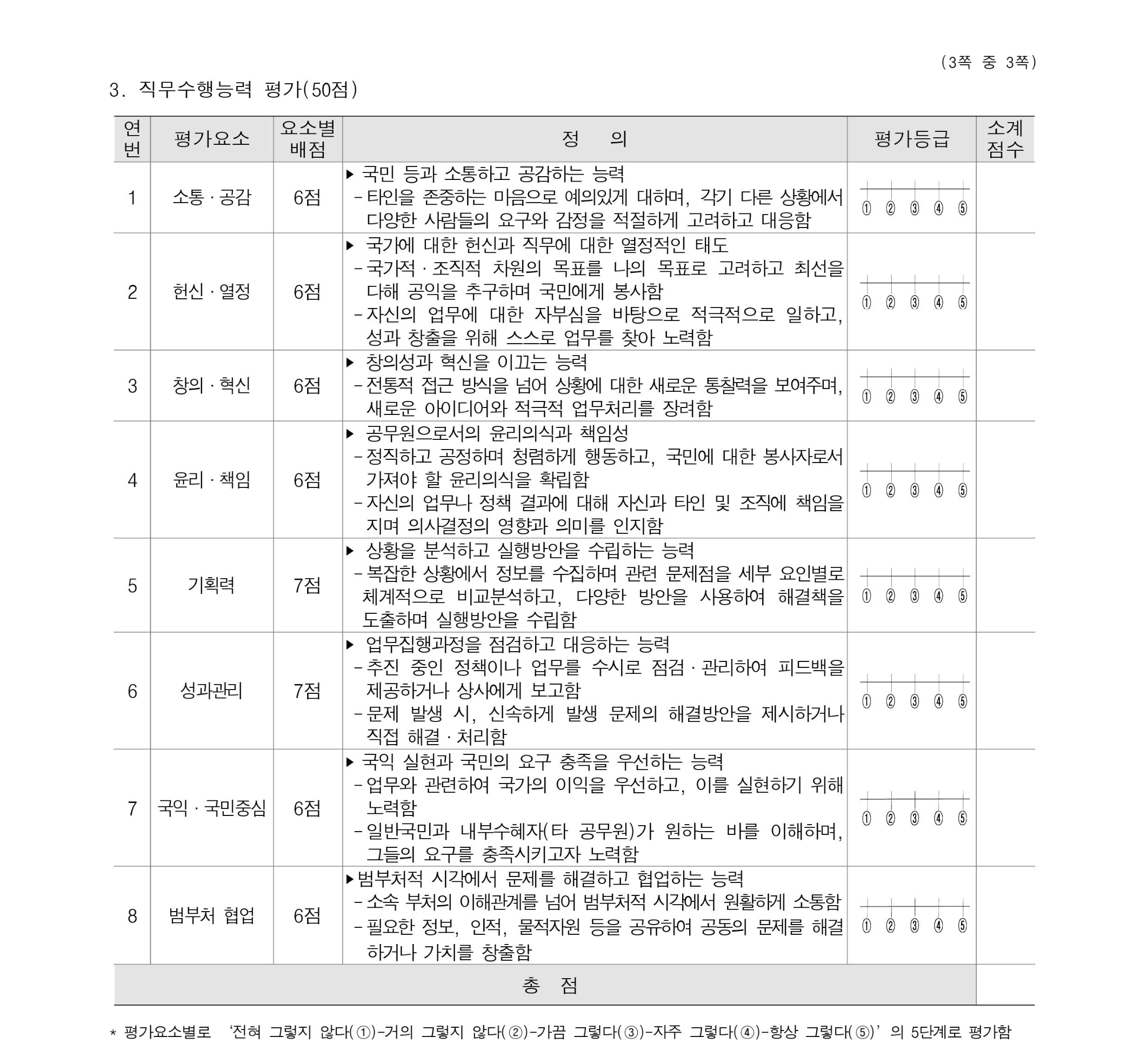 두번째, 직무수행능력에 대한 평가도 마찬가지로 별지 제4호 서식에 따라 평가요소별로 배점을 정하여 평가한다.