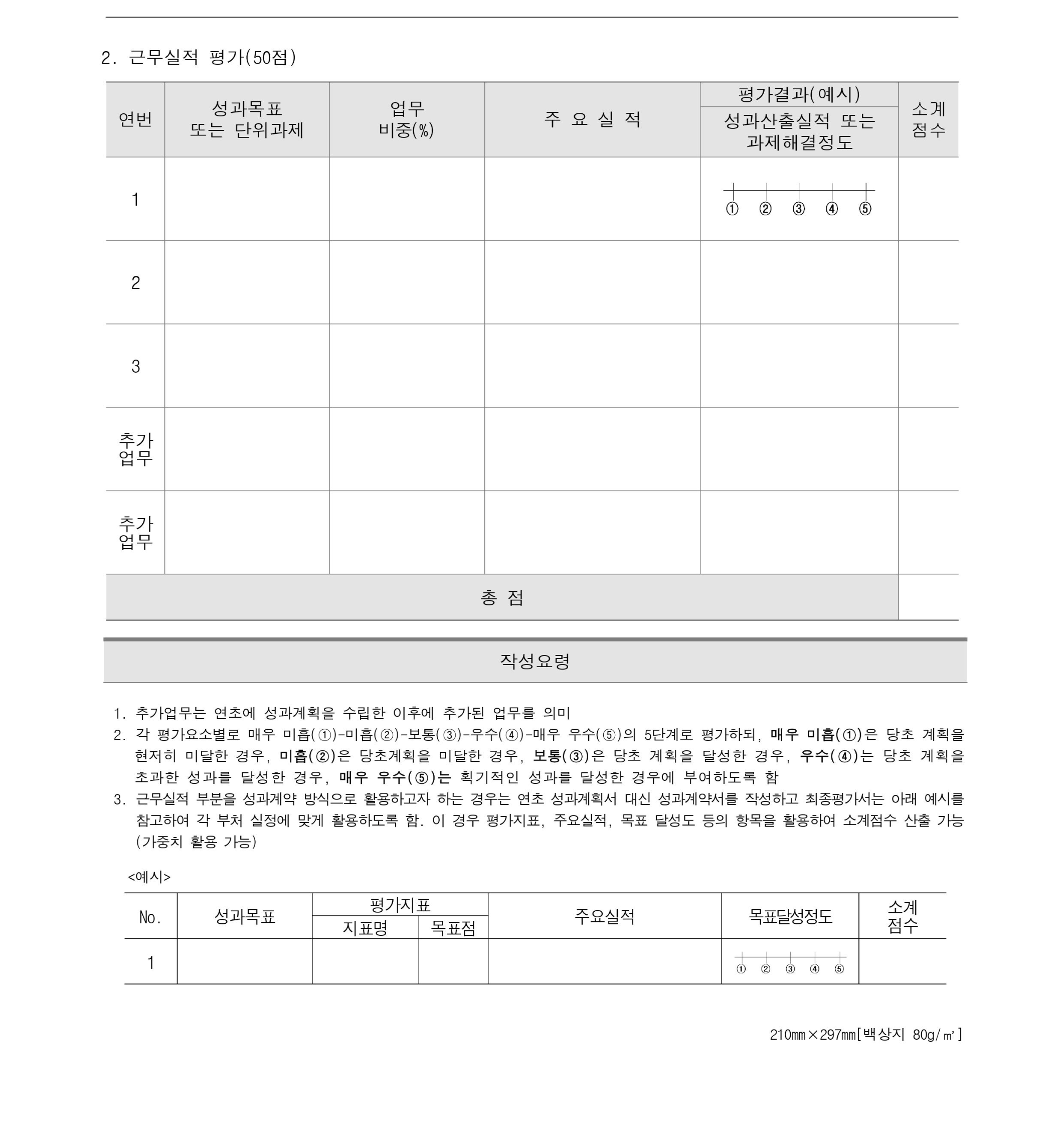 작성 요령을 살펴보면, 연초의 성과목표 또는 단위과제 이외에 연도 중간에 추가된 업무도 포함하여 평가하도록 하고 있으며(작성요령 1.), 각 평가요소별로 5단계로 평가하되, 계획을 달성했다면 "보통"을 부여하도록 하고 있다. 이 "보통" 등급이 성과평가의 기준점이다.