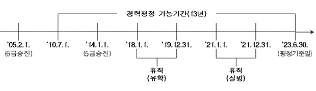 = 9년 6월('14. 1. 1. ~ '23. 6. 30.) - 1년[유학휴직('18. 1. 1. ~ '19.12.31.)의 1/2] - 1년[질병휴직('21. 1. 1. ~ '21. 12. 31.)]