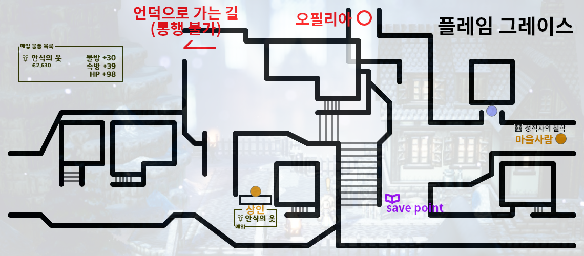 또한 플레임그레이스 지도를 다시 보면 오른쪽 마을사람을 인도하면 성직자의 철학이라는 기술을 가진 NPC를 데리고 다닐 수 있다.