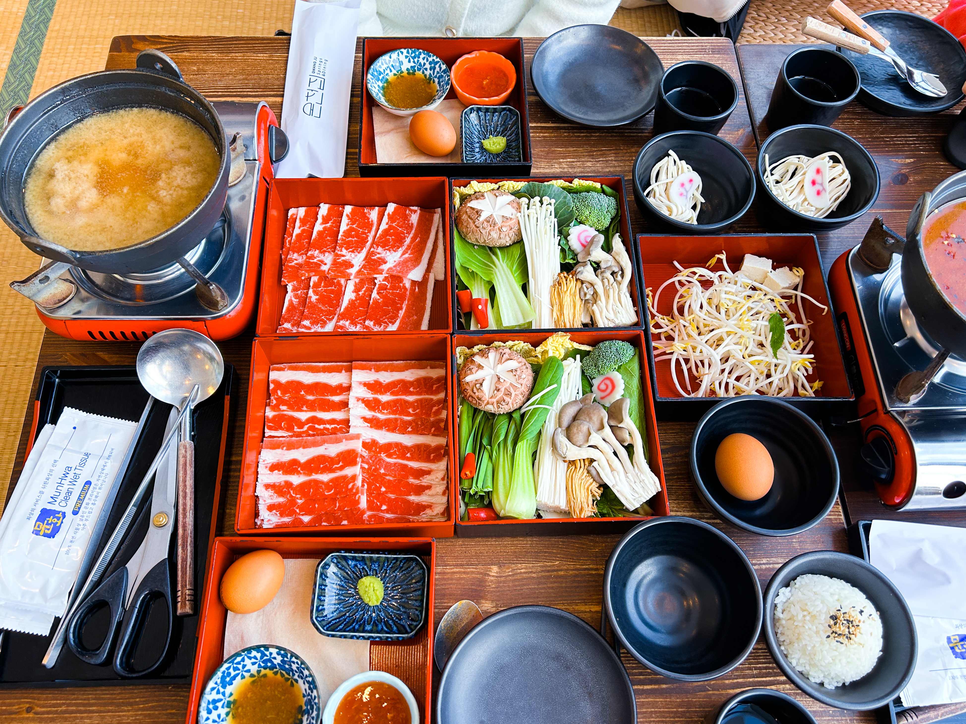 고기랑 야채는 추가시 유료, 숙주와 칼국수는 무제한 리필입니다. 소스에는 노른자만 빼내서 와사비와 함께 섞어서 먹으라 안내해줍니다.