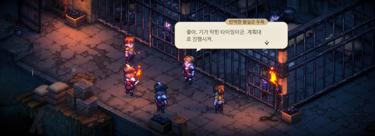시민으로 위장한 왕실군이 애꿎은 시민을 구금하고 있다. 게임상으로 '반역한 왕실군 병사'라고 나오는 것으로 보아, 군복 차림의 사람들은 반란군의 일당으로 보인다. 잡혀온 시민들은 자신이 억울하다며 호소하고 있다.