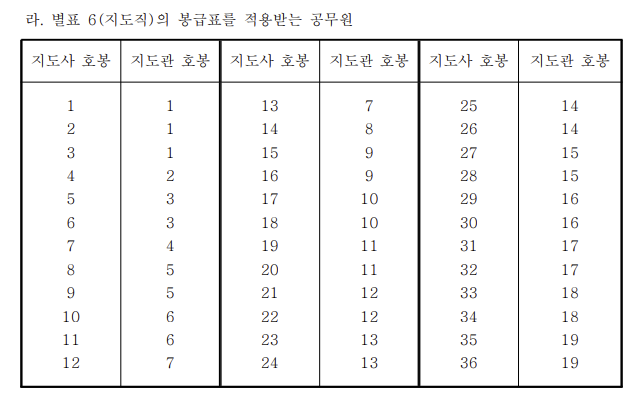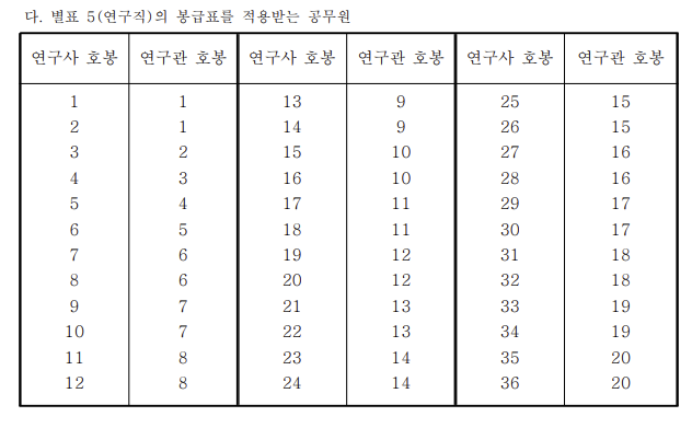 별표 5, 6의 적용을 받는 연구직, 지도직의 경우는 더 심하다. 36호봉이 19호봉, 20호봉이 된다... 이쯤되면 1호봉만 깎이는 걸 감사히 여겨야 하는 것인가? 사실 그렇지는 않다. 참고를 위해 연구직의 봉급표를 한번 살펴보도록 하자.