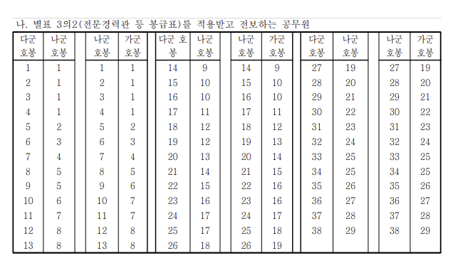 이제부터는 머리가 아프다. 별표 3의2 적용을 받는 전문경력관의 승진 호봉 획정표이다. 전문경력관은 계급이 없이 전보로 승진을 한다. 다군에서 나군 또는 나군에서 가군의 직군으로 전보하게 되면 사실상 승진한 것이다. 그렇기에 호봉도 상위 직군으로 전보하게 되면 위의 표에 따라 조정하여 획정하게 된다.