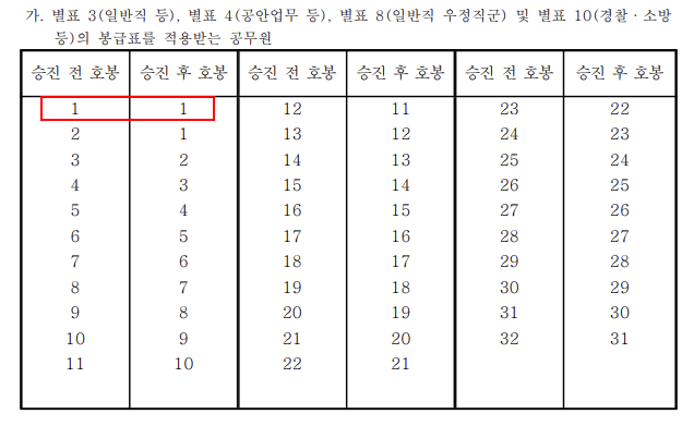 다만, 단순히 그냥 같은 호봉을 유지한 채로 승진하지 않고 2항에서 언급한 별표 28을 따르기 때문에 조금 복잡해진다.