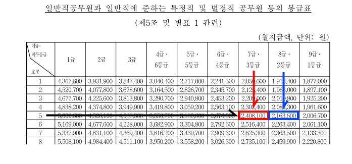 먼저 일반직, 공안직, 우정직, 경찰, 소방공무원의 봉급표를 적용받는 공무원이다.