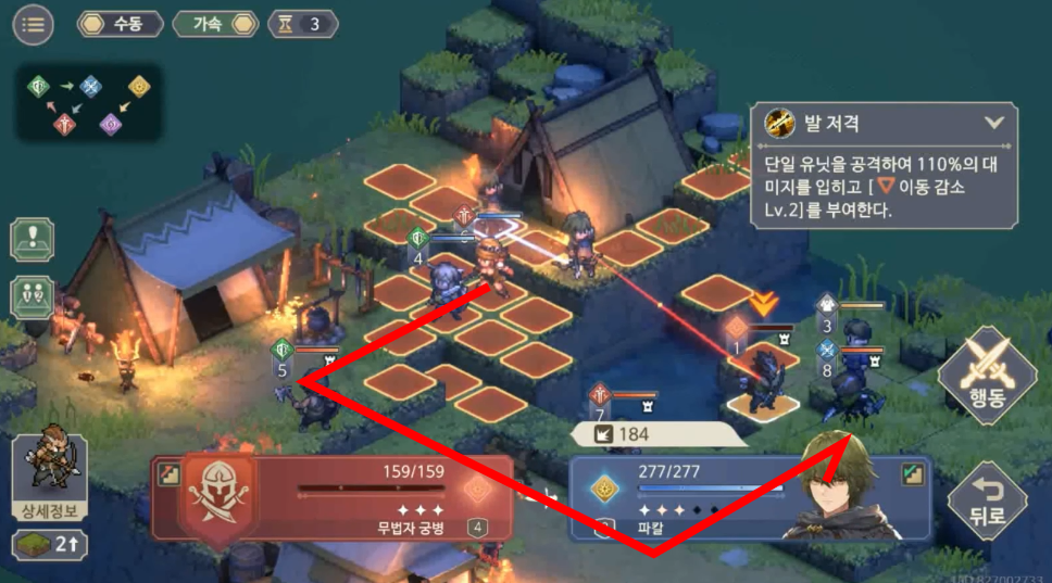 원래는 이렇게 진행해서 마지막에 맨 오른쪽 평민을 만나야 하는데, 파칼이 있다면 바로 저 자리에서 저격이 가능하다. 사실상 이 스테이지의 결말을 미리 당겨 볼 수 있다.