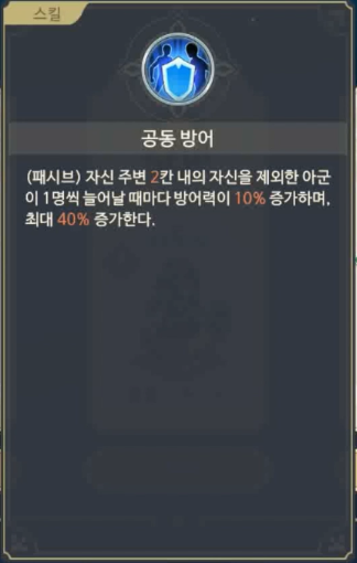 마이타 : 공동방어, PVP 컨텐츠가 아닌 이상 5명 이상 출전하는 경우가 극히 드물기 때문에 사실상 자신을 제외한 4명이 2칸 내로 움직이지 않는 이상 풀 효과를 받기는 어려운 패시브이다. 다만 후에 마이타가 주변 아군의 물리공격을 1회 막는 지원 스킬을 갖게 되면, 시너지 효과가 많이 나는 편이다.