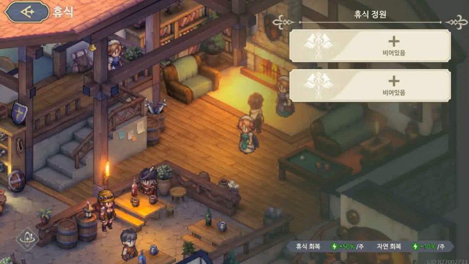 아무것도 안하는 캐릭터들은 자연적으로 10% 회복을 하고, 휴식을 통하면 50%의 스태미너를 회복한다.