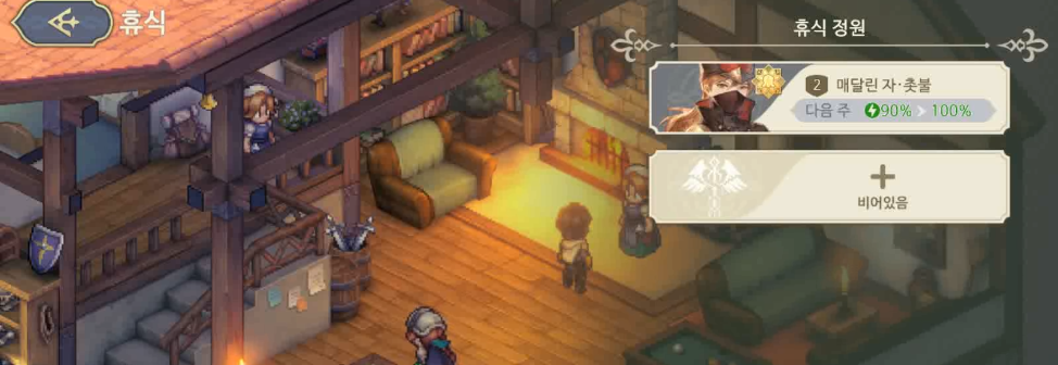 다음 주가 되면 100%로 전투에 참여할 것이다. 참고로 휴식은 아무런 행동을 하지 않은 캐릭터들만 가능하다. 즉, 의뢰를 먼저 진행한 후에 거기서 소모한 스태미너를 충전하겠다는 의미로 의뢰 → 휴식 순으로 진행해봤자 의미가 없다. 의뢰에 참여한 캐릭터들은 <전투 복귀> 라는 타이틀이 붙어 휴식을 진행할 수 없다.
