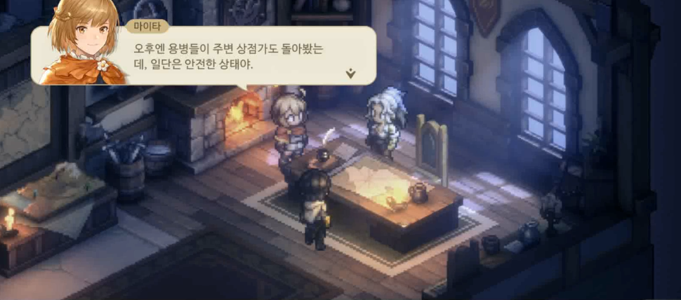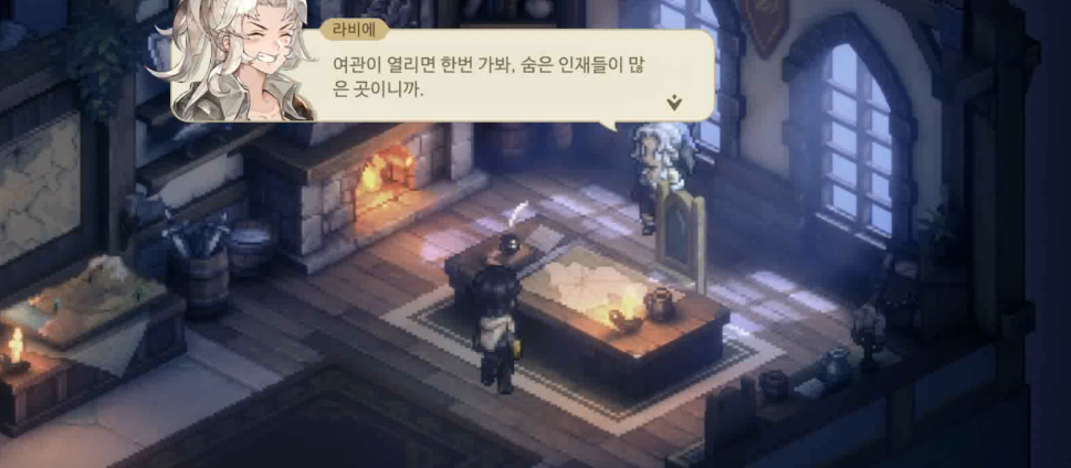 갈수록 일이 많아지니 용병단에도 사람이 필요하다. 여관으로 가서 인재를 모집하라는 이야기를 해주는 라비에