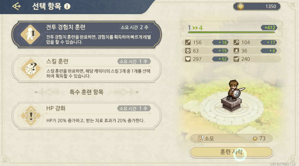 등급이 낮은 캐릭터들도 키워두면 좋다. 후에 파견이나 결정석 미션을 깨는데 일정 레벨 이상의 용병들이 필요하기 때문이다. 어차피 특별히 훈련이 필요한 용병이 있지도 않으니 이런 기회에 낮은 등급의 캐릭터 훈련하나 해두고 가자