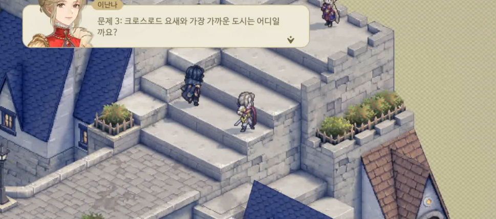 정답은 스즈란 마을(콘발라리아 마을)이다. 북쪽은 태양의 성, 서쪽에 격랑성, 남쪽에 석양성을 두고 이 세개의 성이 크로스 되어 만나는 곳이 바로 크로스로드 요새인데 이 바로 옆에 위치한 도시가 바로 스즈란 마을이다.