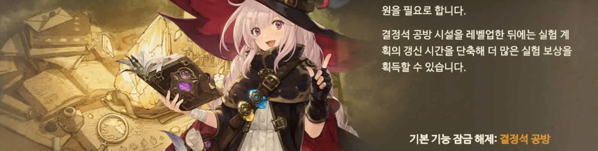 이렇게 결정석 공방 기능이 열린다. 지금부터는 전술 스킬을 결정석을 통해 획득, 강화할 수 있게 된다.