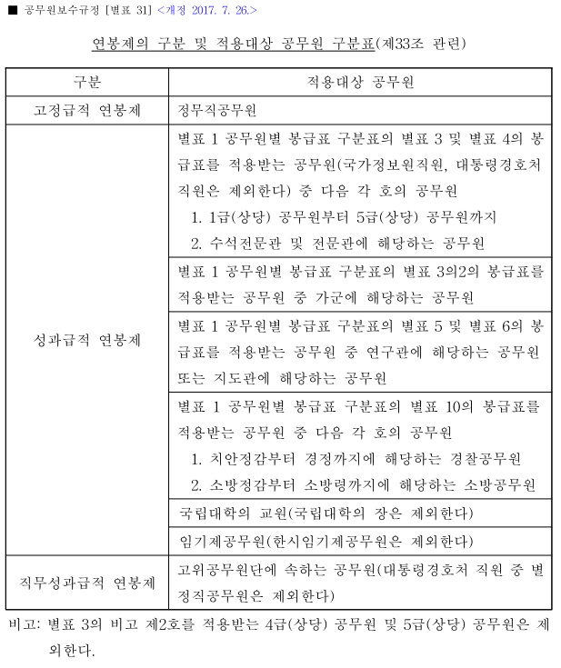 고정급적 연봉제 적용을 받는 공무원은 정무직공무원으로 몇 되지 않기 때문에 별표 32로 규정하고 있다.