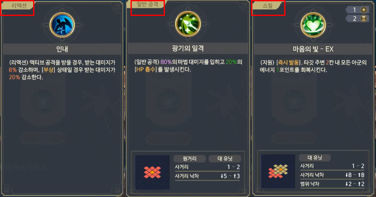 츠리노단 촛불 용병 훈련이 끝났다. 기가 막히게 스킬 종류별로 하나씩 다 나왔다. 스킬은 일반공격 1, 리액션 1, 스킬 3개로 구성된다고 지난 포스팅에서 이야기한 적이 있다. 상황에 따라 필요하다고 생각되는 스킬 하나를 선택하면 된다. 어차피 이 용병은 쓰이지 않을 테니까