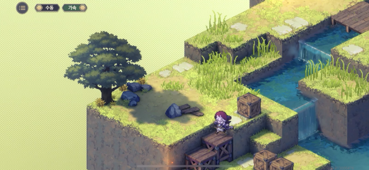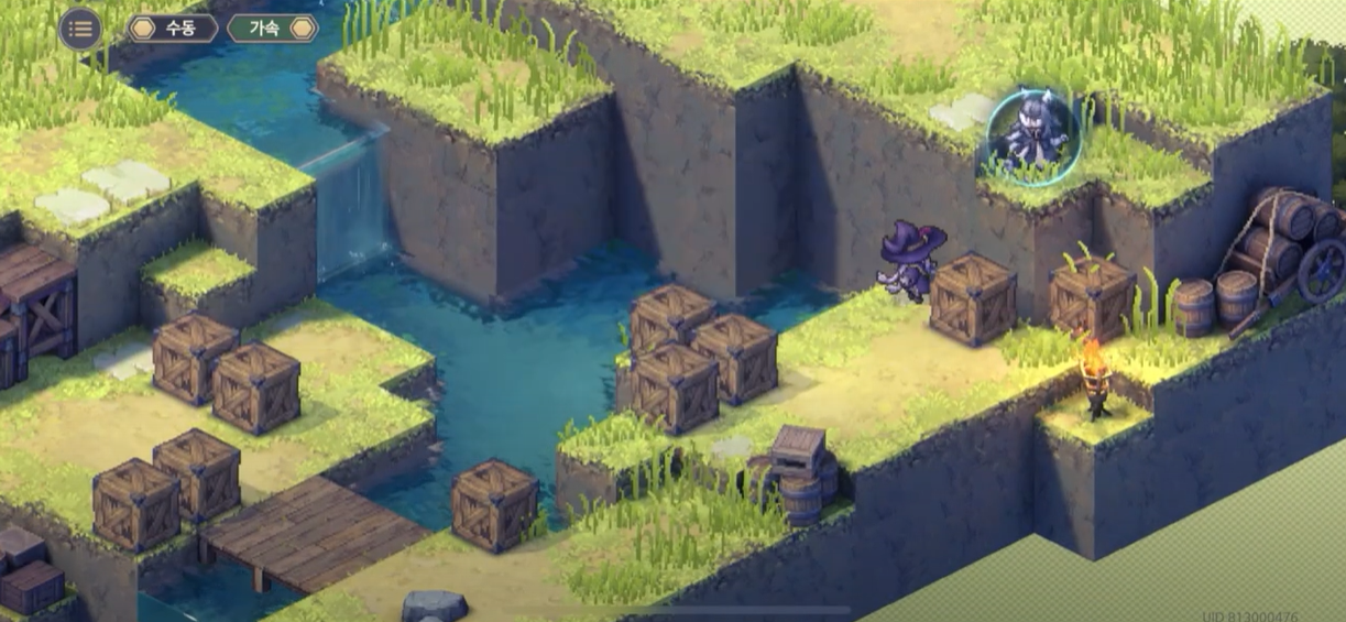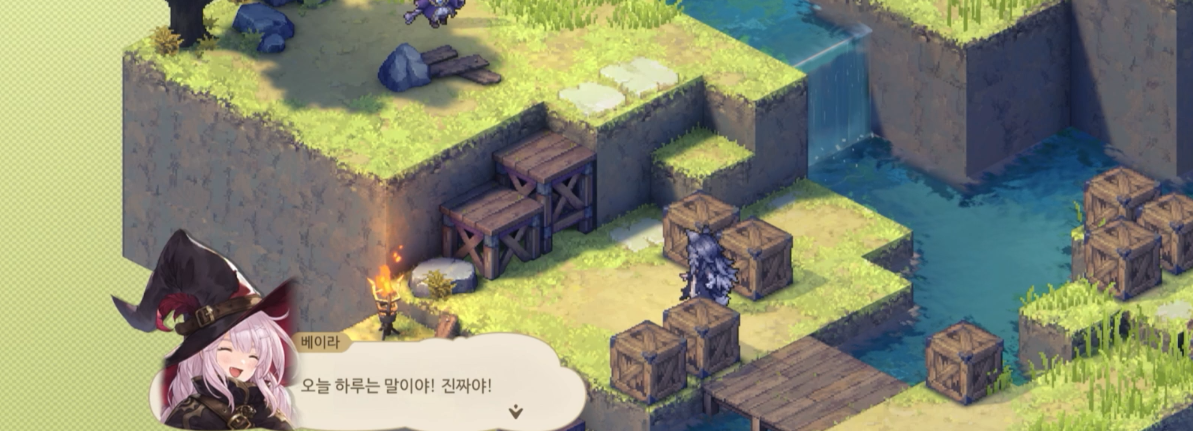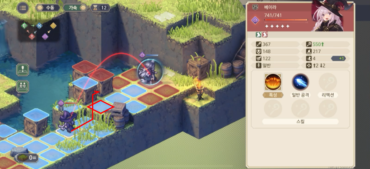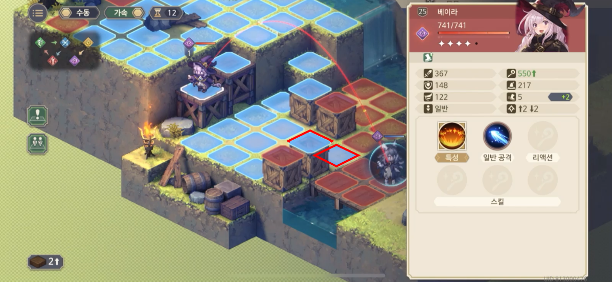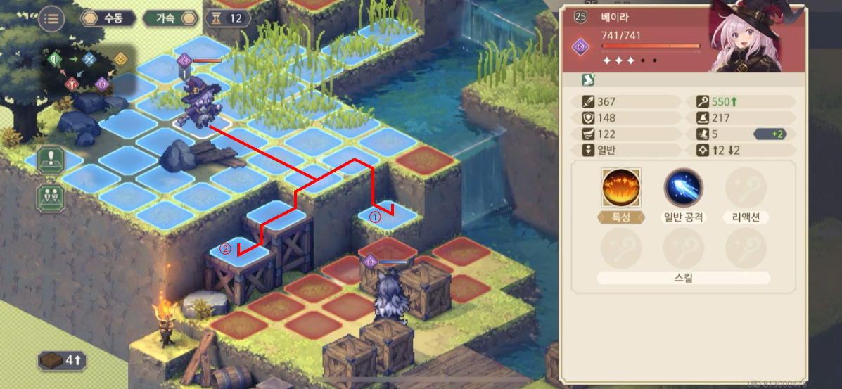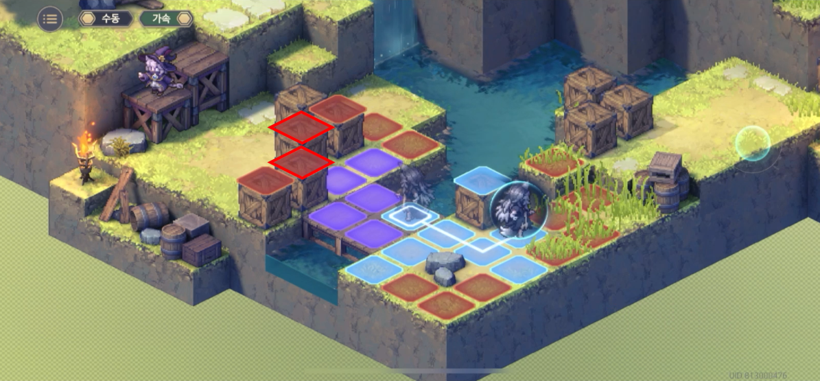 지금 표시된 위치는 기본적으로 1층의 높이를 가지고 있는데 여기서 장애물(+2층)을 설치하게 되면, 총 3칸 차이가 나게 되어, 등반 버프가 없는 베이라는 모모가 설치한 장애물이 있는 방향으로는 진행하지 못한다.