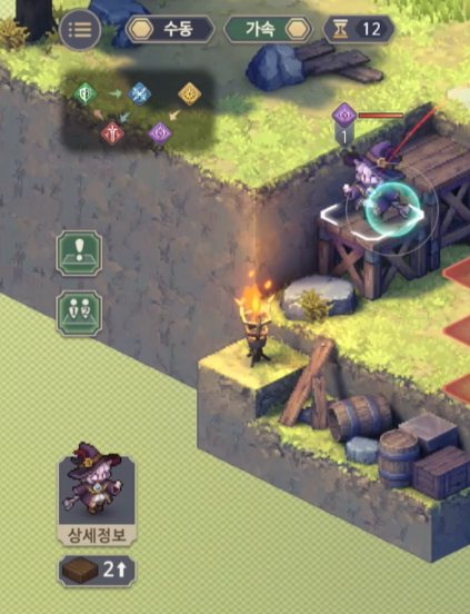 지금 표시된 위치는 기본적으로 1층의 높이를 가지고 있는데 여기서 장애물(+2층)을 설치하게 되면, 총 3칸 차이가 나게 되어, 등반 버프가 없는 베이라는 모모가 설치한 장애물이 있는 방향으로는 진행하지 못한다.