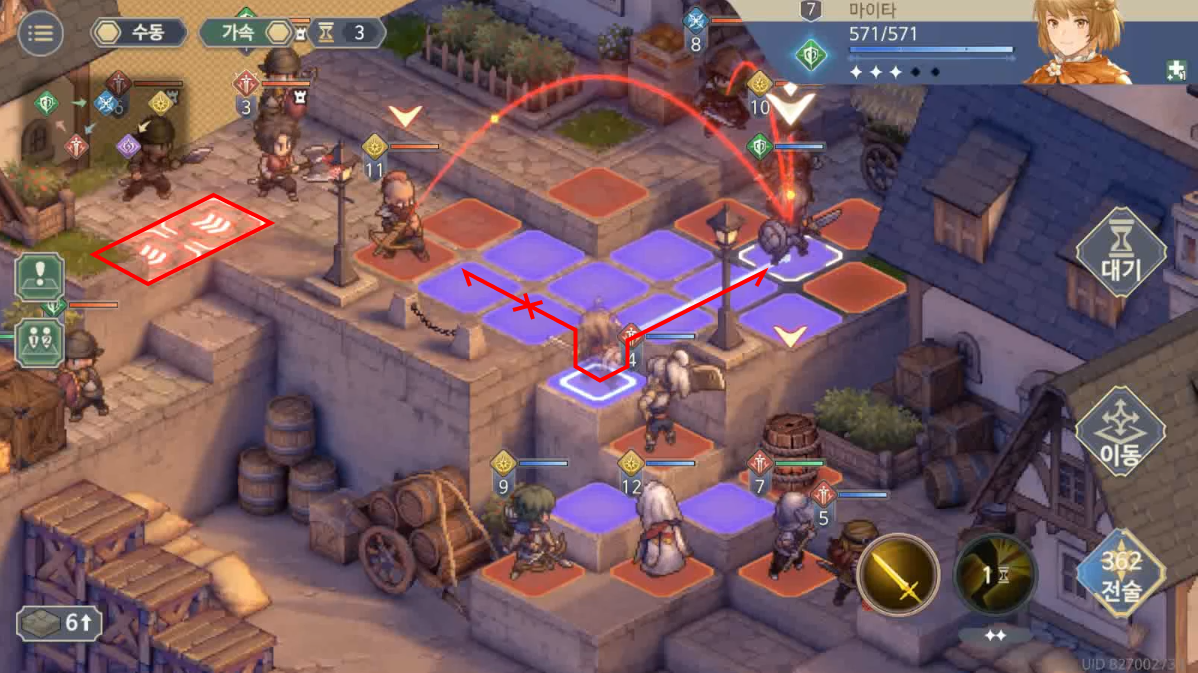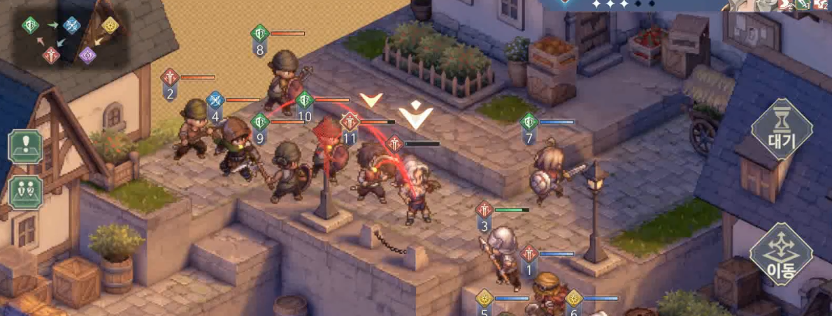 아래쪽을 대충 정리하고 올라가면 양쪽에 적들이 위치해있다. 앞에는 4명만 있는 것 같지만 다음 턴이면 적이 또 추가된다. 적들이 많은데 오른쪽 2명의 적까지 양방향으로 들어오면 감당하기가 어려우니 오른쪽을 먼저 정리하도록 하자