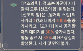 내용 자체는 이해가 어렵지는 않을 것이다. 이해가 안되는 용어는 해당 포스팅 참고. 지나가기만 해도 발동이 되는데, 행동 종료마다 HP가 35%나 뺏어가는 어마어마한 비용을 지불하는 힘이다. 여기에도 고지대 보너스가 붙어있다.