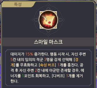스마일 마스크라는 특성으로 인해 루트피는 자신의 5칸 이내의 임의의 적군들 중 3명이나 경계를 무효화 해버린다