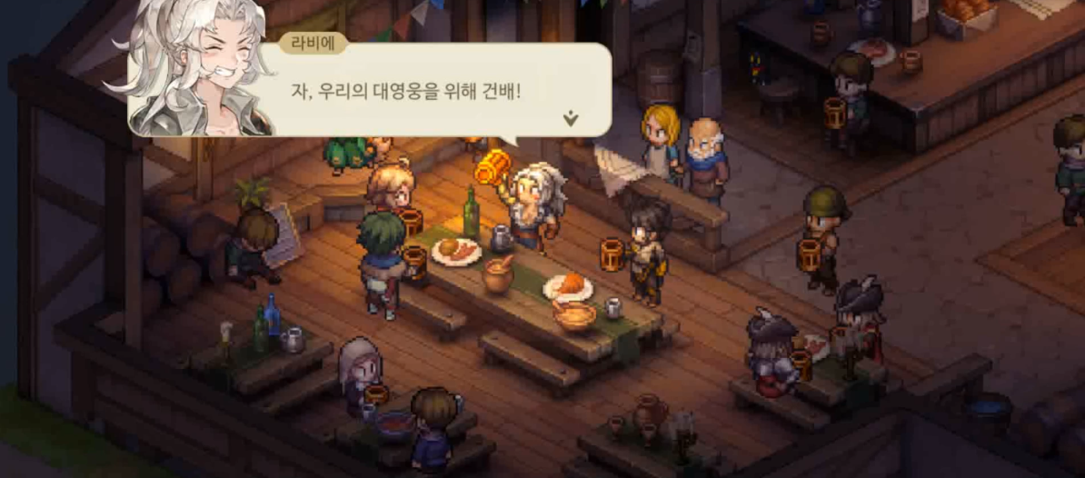 마을을 어느정도 안정시키고 회식을 진행하는 스즈란 용병단. 술을 진창 마시고