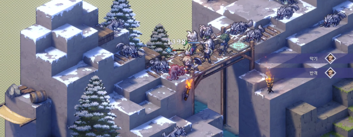 늑대들은 총 3방향에서 다가온다. 침입자인 늑대들은 역시 이동력이 높아 금방 다가오므로 굳이 나가서 잡기보다는 안쪽에 나무 다리가 있는 곳에서 적을 맞이하면 굳이 수고스럽게 컨트롤하지 않아도 된다