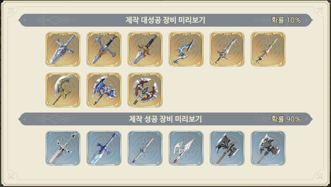 10% 확률로 제작 대성공이 가능한데, 그렇게 되면 한 등급 높은 무기들이 나오게 된다.