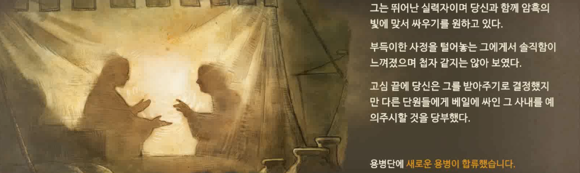 암흑의 빛에서 손을 털고 나온 다크 얼음 주술사 한 명이 용병단에 새롭게 합류하였다. 플레이하다 보면 모집으로만 모든 팀을 구성하기엔 랜덤에 의존하는 경향이 강해지기 때문에, 이를 보완하기 위해서 중간중간 필수적으로 오는 용병이 몇 있다. 그 중 하나이므로 부담없이 사용하면 된다.