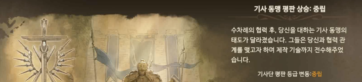 기사동맹 세력 명성을 달성한 결과 기사 동맹이 스즈란 마을을 바라보는 평판이 냉담 → 중립으로 바뀌었다