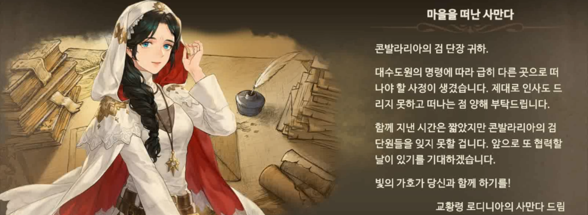전염병을 잠재운 사만다는 이제 스즈란 마을을 떠났다. 교황령 루트를 탔다면 한번이라도 더 만날 테지만, 우선 우리는 영원한 이별이다.