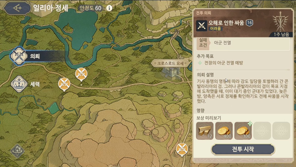 이번 의뢰는 "오해로 인한 싸움". 지난 포스팅에서 살펴본 바와 마찬가지로 기사동맹, 교황령, 일리아에 맞춰 6개의 의뢰가 들어와 있다. 이젠 평판을 더 쌓는 것이 의미가 없지만 그래도 기사동맹 쪽 공략을 해보자.