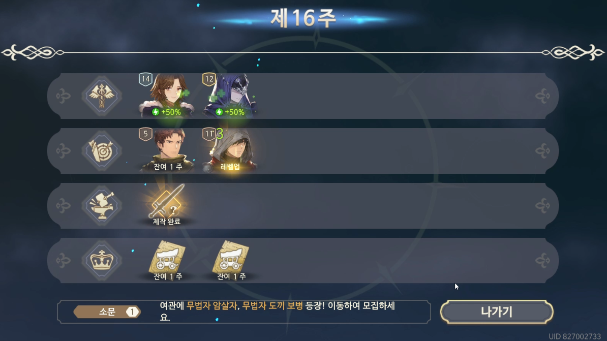 16주차 시작. 무기 제작도 완료되었고, 이번 주에는 여관에 새로운 용병이 등장한다.