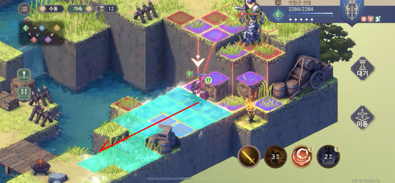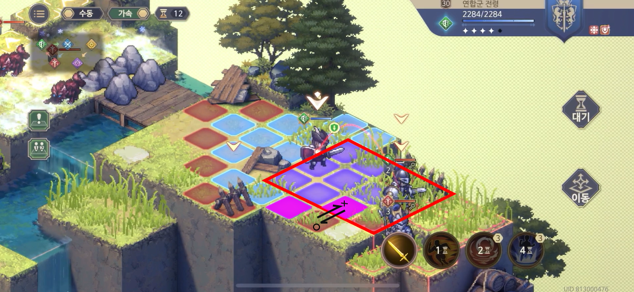 다음 턴 아래쪽 병사의 예상 경계지역이다. 냉기의 영향을 받지 않으면서 경계도 피할 수 있는 지역은 분홍색 뿐이다. 그러므로 "돌진" 스킬을 사용하고 분홍색 위치까지 한번에 진행하자
