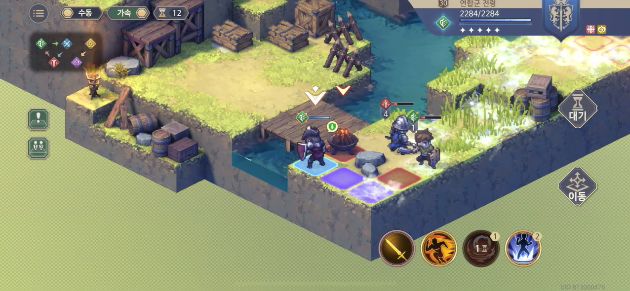 반대로 적들은 꼭두각시가 살아있는 한은 나보다는 꼭두각시를 먼저 공격한다(꼭두각시가 상대의 공격 범위 안에 있을 경우에만). 하지만 꼭두각시는 앞으로 2턴 이상 살아남지를 못하니 앞으로 더 나아가 공격하는 것은 좋지 못하며, 지금 장창병의 HP가 20%도 안남은 것처럼 보이지만, 저것도 때려잡지 못한다...(설계가 그렇게 되어있음). 그런데 앞으로 맞지 않으면서 나아가야 할 적은 두 무리가 남아있어서 각각 한 번씩 꼭두각시를 이용해 넘어가야하므로, 꼭두각시를 쓸 수도 없다(한 전장에 3번 사용 가능, 이미 한 번 사용)