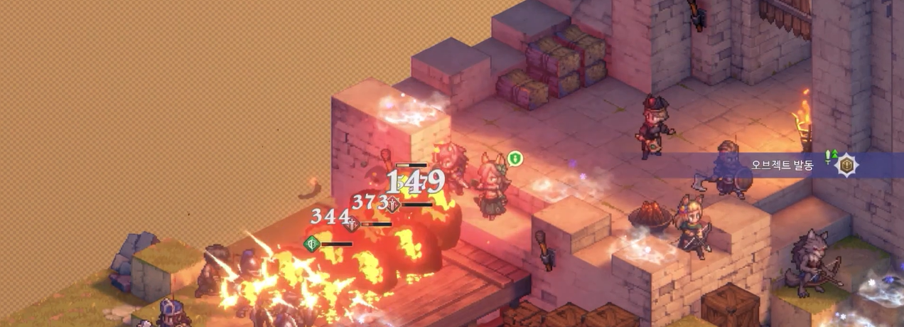 그리고 의아하겠지만 뒤로 돌아 바로 아군을 향해 화로를 작동시켜서 대미지를 주자. 저 뒤의 두 캐릭터는 원래 움직이지 않고 대기하지만 앞의 화로가 사라지면 바로 전장에 합류한다. 한 명이라도 아쉬운 판국이니 자폭을 하더라도 전장에 참여시킨다