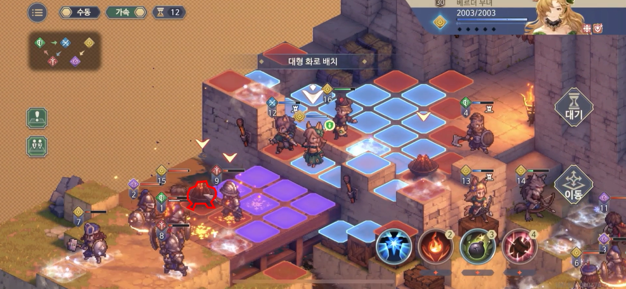 맨 처음 화로 하나를 이상하게 앞에 배치한 이유. 3턴인 지금 베르더 정찰병이 이 화로를 터뜨려서 앞의 적군에게 대미지를 주자. 한 턴도 허투루 쓰면 7턴 안에 절대 클리어 못한다