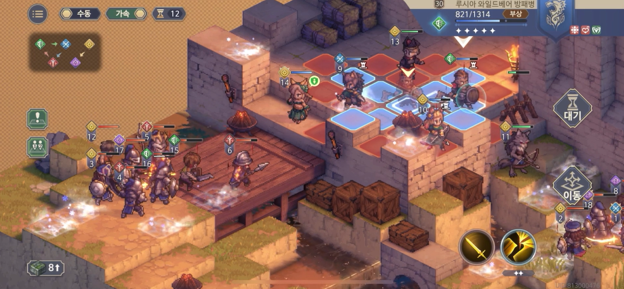 지난번 포스팅과 마찬가지로 횃불병사를 최대한 빨리 처리해주는 것이 무조건 편한데, 1턴에서 서리늑대 사냥꾼을 전장에 참여시킨 것이 이곳에서 빛을 발한다. 만약 운이 좋아서 크리티컬이라도 터지면 다음 턴에 베르더 명사수로 바로 저격이 가능하다. 생각보다 잘 터지니 리트라이를 하는 것도 좋은 방법이지만, 필자는 운에 맡기지 않기로 했으니 크리티컬이 터지지 않은 판을 가지고 왔다