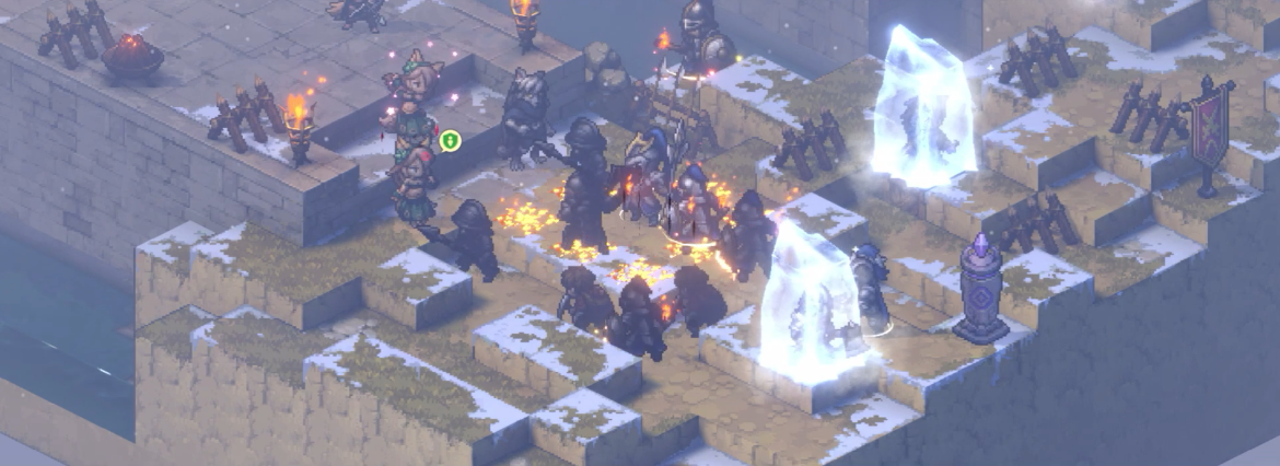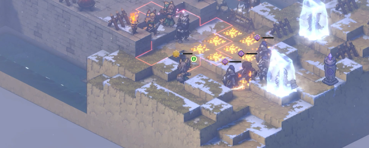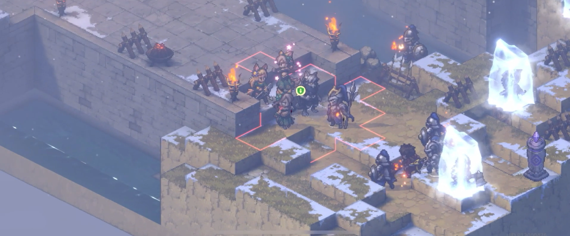 다만, 첫 턴에는 적들이 좋은 포지션으로 위치해있으니 눈보라를 조금 맞더라도 화로와 폭약통을 다음과 같이 설치한 뒤 작동 시키면