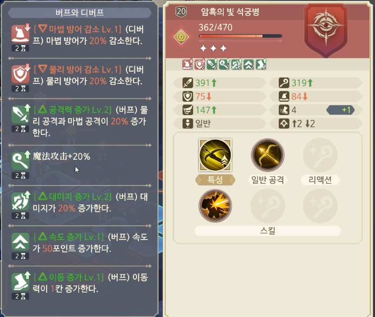 야미노단의 흑마법사는 아군에게 일정량의 HP를 깎고, 받는대미지가 높아지는 디버프를 부여하는 대신 모든 공격력과 속도 등 전반적으로 캐릭터를 강하게 만드는 버프를 부여한다