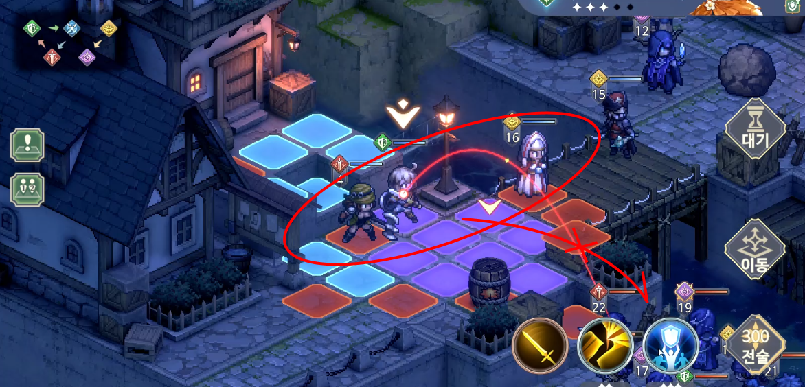 오른쪽 부대도 마찬가지지만, 회전석을 이용하여 적을 많이 줄일 수 있다. 적의 이동이 어느정도 끝난 다음에 회전석을 굴려주면